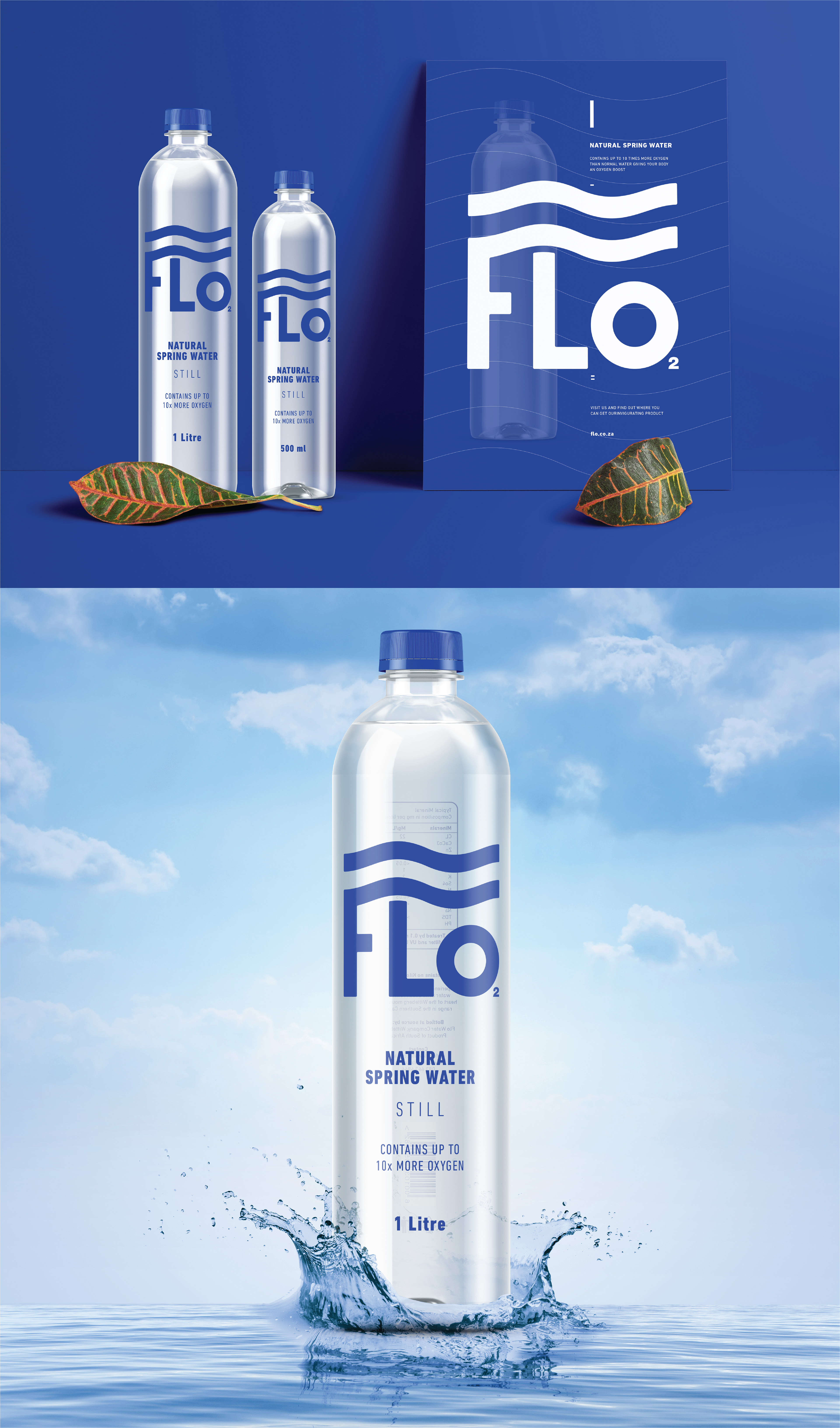 Packaging and identity design for Flo Mineral Water with 10x more oxygen.